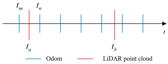 If a corresponding moment in time is not available, linear interpolation of odometer data can be utilized to interpolate a frame of point cloud data. Let and be two consecutive moments in odometer data, and , as illustrated in Figure 7.