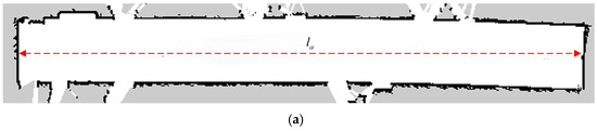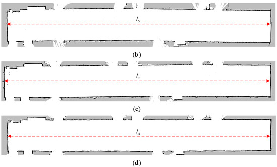 In the closed corridor environment with a length of 30 m, the mapping effect of the optimized distortion point cloud using different methods was compared with the Gmapping algorithm used for mapping. The experimental results, as depicted in Figure 9, display Figure 9a as the original distorted point cloud. Additionally, Figure 9b–d demonstrates the optimized point clouds obtained using VICP, IMU and odometer-based methods, respectively. Dimension represents the real size of the corridor environment, while ~ is measured multiple times using the measure tool in RVIZ by capturing three sets of points on the top, middle and bottom of the map, and then averaging the values.