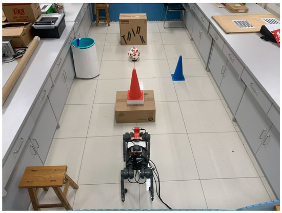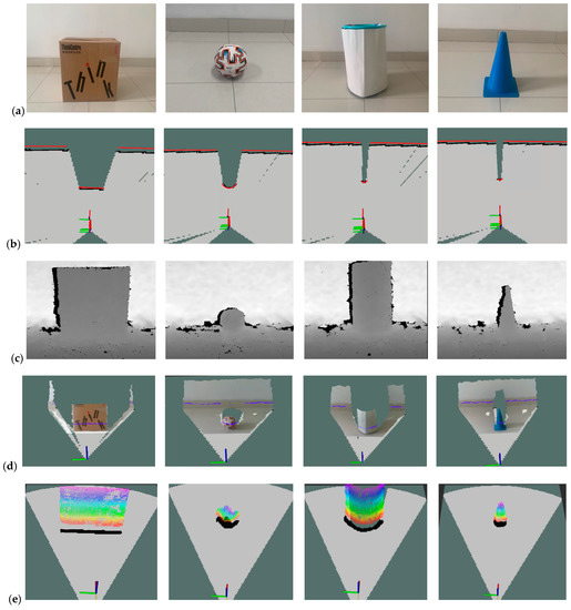 For the typical obstacles depicted in Figure 10a, obstacle detection was carried out using both the 2D LiDAR (RPLiDAR_A3) and the RealSense D435 depth camera. The standing height of the robot dog was adjusted when using different sensors. It was ensured that both methods accurately detected the obstacles. The experimental results are presented in Figure 10b–e.