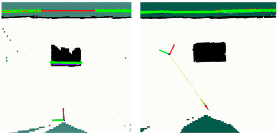 The PF method enhances the capability to detect obstacles in the forward direction, however it may not accurately construct an obstacle contour map. As shown in Figure 12, initially, the PF algorithm successfully detected a rectangular cardboard box obstacle (Figure 11, ④) and constructed a partial contour map. However, as the robot dog moved closer to the obstacle, the camera lost visibility of the cardboard box, and the scanning plane height of the LiDAR was higher than the box. Consequently, on the map, the rectangular box obstacle appeared as a sheet-like planar obstacle.