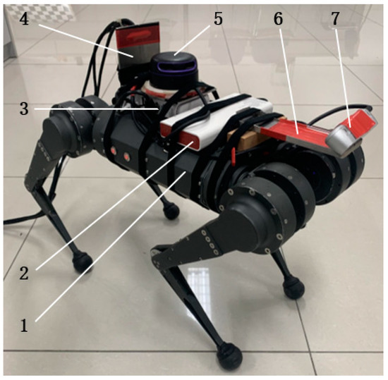 Quadruped robot dog experimental platform. 1—Yobogo quadruped robot dog platform; 2—power bank; 3—router; 4—LiDAR protective plate; 5—2D LiDAR (RPLiDAR_A3); 6—fixture for securing the camera; 7—RealSense D435 depth camera.
