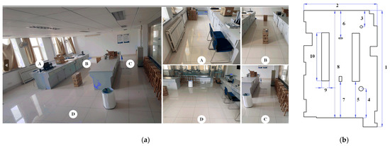 Open laboratory environment for experiments. (a) Laboratory environment. (b) Ten sets of dimensions.