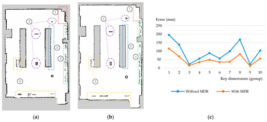 Comparison of PMF algorithm SLAM mapping results with and without MDR. (a) Without MDR. (b) With MDR. (c) Comparison of errors between 10 sets of dimensions and actual measured dimensions.