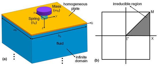 A periodic LR plate with one side submerged in a heavy fluid is considered in this research. The periodic LR plate comprises a uniform base plate and periodic LR units, where a unit element is shown in Figure 1a. The resonator consists of a mass block with mass and a linear spring with spring stiffness . The linear spring connects the mass block and the uniform base plate. The LR plate’s unit element has the dimensions of length , width , and thickness . Figure 1b shows the first Brillouin zone of the unit element, which can be used to calculate the band structure.