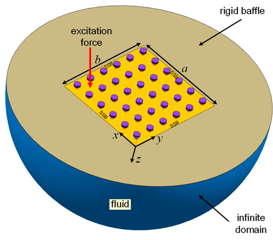 Schematic of a finite locally resonant plate baffled in an infinite rigid baffle and single-side submerged in the infinite fluid (SSB: simply supported boundary).
