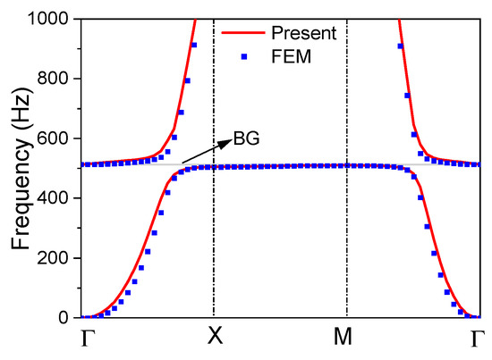 It can be seen from Figure 3 that the dispersion curves calculated by the present model agree very well with the results from the FEM model. The band-gap frequency ranges calculated from the two models are compared in Table 1, which shows that the band-gap start frequency, cut-off frequency, and bandwidth of the analytical results are pretty close to the FEM results.