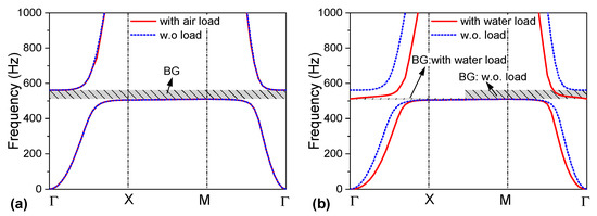 Dispersion curves of the locally resonant plate (a) with air load and without load, and (b) with water load and without load (w.o.: without, BG: band gap).