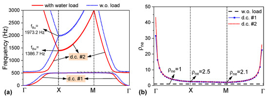 where is the structural wave number, and can be given as when a single plane wave is considered (). For simplicity, the normalized effective density is used and defined as , where is the density of the base plate. The normalized effective densities of the LR plate with water load and without fluid load are shown in Figure 5b, and corresponding dispersion curves are given in Figure 5a for comparison purposes.