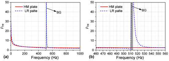 In order to further explain the attached mass’s characteristics, the normalized effective density of the water-loaded LR plate as a function of frequency is given in Figure 6, together with the water-loaded homogeneous (HM) plate without LR units for comparison purposes. As shown in Figure 6, the normalized effective density of the water-loaded HM plate decreases with increasing frequency, indicating that the water fluid provides a significant attached mass in the low frequency and a slight attached mass in the high frequency. The normalized effective density curve of the water-loaded LR plate has the same variation trend as that of the HM plate, except for the frequencies near the resonant frequency. In the frequency range of 191.3~510.1 Hz below the band gap, the normalized effective density of the LR plate is slightly smaller than that of the homogeneous plate. While above the band gap is between 512.8 Hz and 530.0 Hz, the normalized effective density of the LR plate is significantly increased, induced by both the fluid and the LR units.