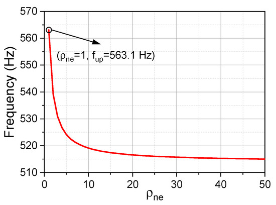 As shown in Figure 7, the upper frequency of the band gap decreases with the increase of normalized effective density. When , the estimated frequency is 563.1 Hz, which is quite close to the accurate results of the unloaded LR plate shown in Table 2 (561.6 Hz). When exceeds 30, tends to the resonator’s resonant frequency (514.0 Hz) and is close to the upper frequency calculated in Table 2 (512.8 Hz).