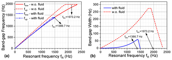 Figure 8 shows the band-gap frequency and bandwidth of the LR plate with and without water fluid load as a function of the resonant frequency . As shown in Figure 8a, the lower band-gap frequency increases with increasing resonant frequency for the LR plate without fluid. In contrast, the upper band-gap frequency first increases and then keeps at a constant value of 1973.2 Hz, which is exactly the Bragg frequency . As a result, the band-gap width of the LR plate without fluid first increases and then decreases with the increase of , reaching the maximum at approximately 1800 Hz. The band-gap frequency and the band-gap width curves of the LR plate with fluid have the same variation tendency as that of the plate without fluid, except that its upper band-gap frequency and band-gap width are significantly reduced. The frequency range that can be tuned to control vibration for the LR plate with fluid is 0~1500 Hz, which is inferior to that without fluid, providing the frequency range of 0~2340 Hz.