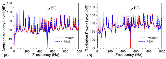 The root-mean-square velocity averaged over the plate surface was used to examine the vibration performance and is given in decibel form, where the reference velocity is . The radiation power level is also calculated with the reference given as . Both the average velocity level and radiation power level are calculated with the theory derived in Section 2.3 and given in Figure 9, together with the results from FEM. It is shown in the figure that the two curves have a remarkable coincidence with each other, which has validated the correction of the theoretical model developed in this research.