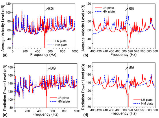 In order to illustrate the vibration and sound reduction performance of the water-loaded LR plate, the vibration and sound radiation results of both the LR plate and HM plate with water fluid are compared in Figure 10. As shown in Figure 3 and Figure 10, the band gaps calculated in an infinite periodic LR plate coincide with the response valleys of the vibration velocity and sound radiation power in a finite periodic plate. In the adjacent frequencies of the band gap (510.1–512.8 Hz), both the vibration and sound radiation of the LR plate are significantly reduced compared with the HM plate.