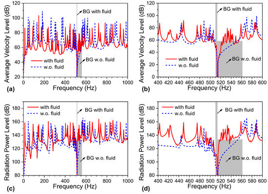 Comparison of (a,b) average velocity level and (c,d) radiation power level between locally resonant (LR) plate with fluid and that without fluid (BG: band gap; w.o.: without).