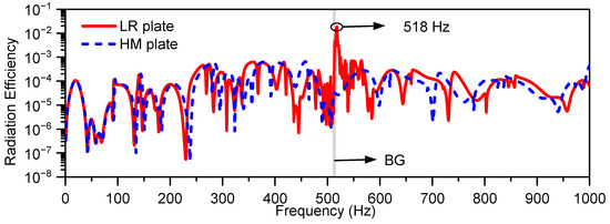 The radiation efficiency of a water-loaded LR plate was also calculated using Equation (42) to further illustrate the vibration and acoustic coupling performance. The corresponding result is given in Figure 12, together with the result of a water-loaded HM plate for comparison purposes.