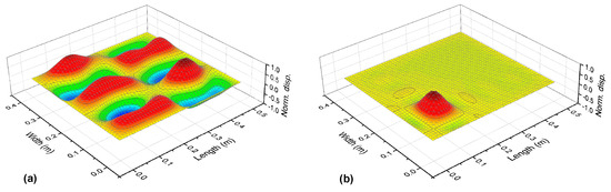 As shown in Figure 12, in most of the frequency range, the radiation efficiency of the water-loaded LR plate and that of the water-loaded HM plate are of the same order in magnitude. However, in the frequency range of 513~525 Hz close above the band gap, the introduction of periodic resonators significantly increases radiation efficiency. In order to explain the mechanism behind the interesting and strange radiation phenomenon, the LR and HM plates’ normalized-displacement spatial distributions at 518 Hz are drawn in Figure 13.