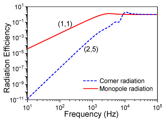 Model radiation efficiencies of corner–radiation mode and monopole–radiation mode.