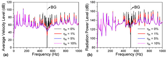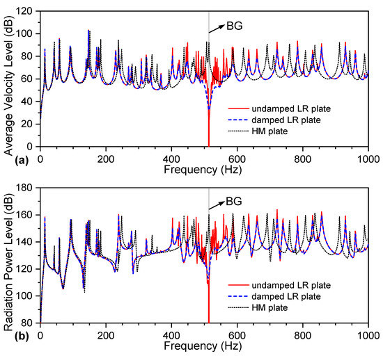 (a) Average velocity level and (b) radiation power level of the water-loaded LR plate (BG: band-gap).