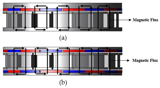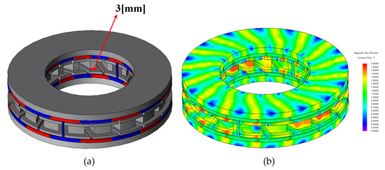 Figure 2a shows the flux path of a single-rotor single-stator-type axial flux motor, and (b) shows the flux path of a double-rotor single-stator-type axial flux motor. The magnetic path of a single-rotor single-stator-type axial flux motor is permanent magnet (PM)—shoe—teeth—stator back yoke—teeth—shoe—PM—rotor back yoke. The magnetic path of a double-rotor single-stator-type axial flux motor is PM—shoe—teeth—shoe—PM—rotor back yoke—PM—shoe—teeth—shoe—PM—rotor back yoke—PM. The back yoke acts as a magnetic path between the permanent magnets. If the thickness of the back yoke is not selected sufficiently, magnetic saturation will occur in the back yoke. When magnetic saturation occurs, the magnetic properties of the material become the same as air, which adversely affects performance [11]. To prevent magnetic saturation, a design that maintains the maximum flux density of the back yoke below a certain value is required. In this study, a value of 1.7 T or less was selected for the load analysis.