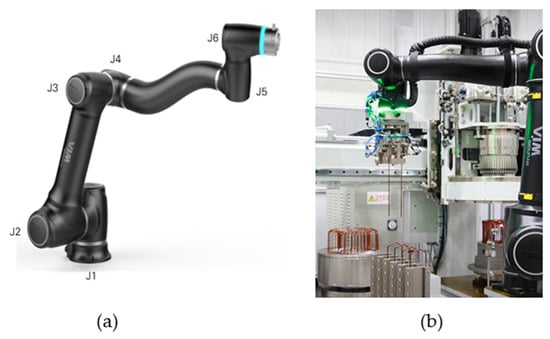 Figure 4a shows the robot joints of a collaborative robot being mass-produced by a company, and Figure 4b shows a collaborative robot in action. The motors for the collaborative robot joints are built in the form of one module per joint, so the wiring must be routed through the hollow shaft. Therefore, the larger the axial and radial diameters of the motor and the shorter the axial length, the more favorable the shape. This is in line with the advantages of axial flux motors, which have a high power density in a structure with a large inner and outer diameter and a short axial length. However, the size of a collaborative robot operating in the same space as a human is not much larger than a human, and the size of the motors for the robot’s joints is small. The small size of the motor makes it physically difficult to have a multipole structure with more than 20 poles.