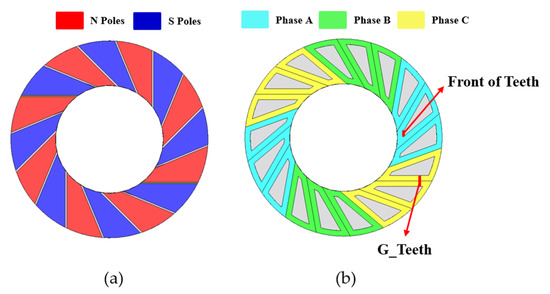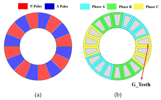 Existing shape: (a) magnet shape and (b) stator winding layout and spacing variable G_Teeth.