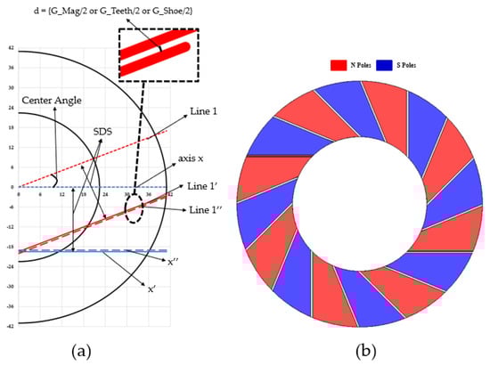 Figure 10a shows how to apply skew to teeth, shoes, and permanent magnets. In (b), we can see the permanent magnet’s shape made using the method in (a). Center Angle represents the mechanical angle occupied by one tooth or shoe or one permanent magnet in a counterclockwise direction based on the x-axis. In the case of 16 poles and 18 slots, the angle occupied by one tooth or shoe is 20 degrees, and, in the case of the permanent magnets, it is 22.5 degrees. For the convenience of explanation, it is described based on the permanent magnet. Since the angle occupied by one permanent magnet from the x-axis passes through the origin at 22.5 degrees and has a tan of (22.5 degrees) as the slope, a = tan (360 deg/N_Poles). Therefore, Line1 can be defined by Equation (3). To create a skew applied shape, a new straight line Line1′ with a distance as much as the red arrow is defined as Equation (4) based on Line1. As b = −SDS/cos(360 deg/N_poles), the size of the separation distance is expressed as SDS, and it represents a distance variable as an abbreviation of same-direction skew. In addition, a straight line separated by SDS from the x-axis in the y-axis direction is defined as x′ by Equation (5). To prevent leakage between permanent magnets, a straight line with a distance of G_Mag/2 below the Line1′ standard is defined as line1″ by Equation (6) to apply the separation distance. c = −(SDS + d)/cos (360 deg/N_poles), where d is G_Mag/2 for the permanent magnets and G_Teeth/2, G_Shoe/2 for the shoes. A straight line with a distance of G_Mag/2 in the upward direction based on x′ is defined as x″ by Equation (7). The shape of the permanent magnet with the skew applied is determined at the intersection of the inner and outer diameter of the rotor back yoke and line1″ and x″. In the case of the teeth, their shape can be determined by having an angle of 360/N_Slots in the counterclockwise direction based on the x-axis and applying G_Mag/2 as L_Slots/2, which is half of the interval between slots. In the case of the shoes, their shape can be determined by defining G_Mag/2 as G_Shoe/2, the distance between the shoes, at the same angle as the teeth.