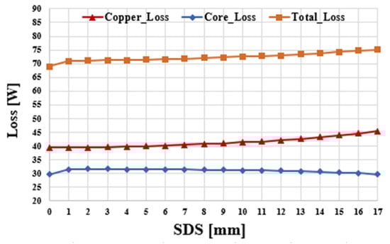 Figure 16 shows the no-load line voltage according to the increase in SDS in the double-rotor single-stator type. The double-rotor single-stator type has a double-air-gap structure and has a relatively low output compared to the single-rotor single-stator type in small sizes such as co-robot motors. According to the increase in SDS, the line-to-line voltage at no load continues to increase until SDS = 18. In the case of the double-rotor single-stator type, the effect of increasing the tooth length according to the increase in SDS is greater because the thickness of the back yoke of the rotor on both sides is reduced at the same rate. The effect of the reduction in flux linkage due to the decrease in tooth area as the SDS increased, which was observed in the single-rotor single-stator type, was not observed until SDS = 18. Figure 17 shows the copper loss, iron loss and total loss according to the increase in SDS in the double-rotor single-stator type. As the SDS increases, the sides of the teeth become longer. Since the effect of increasing the tooth length is greater than that of the single-rotor single-stator type, the range of increase in copper loss is also greater. The iron loss shows an increasing aspect as the SDS increases. In the doble rotor single stator type, copper loss is more dominant than iron loss and the increase is large, so the total loss increases more steeply than the single-rotor single-stator type. Figure 18 shows the shaft torque under load according to the increase in SDS of the double-rotor single-stator type. In Figure 16, the line-to-line voltage at no load showed a steady increase according to the increase in SDS. The shaft torque under load also shows a steady increase. This is because the effect of increasing the performance due to the increase in tooth length is higher than the effect of copper loss. As same-direction skew is applied, Front of Teeth gradually decreases. To increase the possibility of actual production, the minimum thickness of the front of teeth of the final model was selected as 3 mm. The skew variable of the final model is SDS = 15. Figure 19 shows the performance comparison between the conventional model and the model selected with SDS = 15 in Double-rotor single-stator type. Figure 19a shows the line voltage comparison at no load. The conventional model has Vrms = 21.6 Vrms and THD is 0.57%. SDS = 15 model increased by 14.4% to 24.7 Vrms, and THD increased to 2.4%, but it was judged to be acceptable below 5%. Figure 19b shows the air gap torque comparison under load. The air gap torque increased by 16.7% from 0.54 Nm to 0.63 Nm. Torque ripple decreased by 13.3% P from 44.9% to 31.6%. Compared to the conventional model, the final model increased the line voltage at no load by 16.2%. Copper loss increased by 24.4%, iron loss increased by 5.1%, and total loss increased by 13%. In addition, the shaft torque under load increased by 20% compared to the previous one, which means that the power density also increased by 20%. Figure 20a shows the final shape of double-rotor single-stator type (SDS = 15). Figure 20b shows the magnetic flux density under load. The maximum saturation of the back yoke did not exceed 1.7 [T].