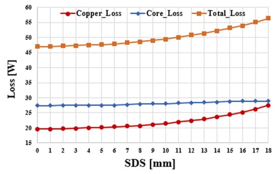 Figure 7a shows the existing geometry with no skew applied to the rotor’s permanent magnets. Figure 7b shows the stator geometry with no skew applied, indicating the winding layout and tooth spacing as G_Teeth. Figure 8a shows the geometry with skew applied to the rotor’s permanent magnets. Figure 8b shows the stator geometry with skew applied. In Figure 8b, the winding layout is shown with the tooth spacing as G_Teeth and the front of the teeth close to the inner diameter as Front of Teeth. G_Teeth also refers to the physical thickness of winding that the number of turns can be wrapped around at the tooth spacing. As the skew is applied, the area of the teeth gradually decreases, and the front part of the teeth gradually becomes thinner. When the front of the teeth is very thin, it is difficult to manufacture, vulnerable to magnetic saturation, and has difficulty withstanding winding tension. In this paper, the minimum thickness of the front end of the teeth was selected to be more than 3 [mm]. In addition, to minimize performance degradation due to the reduction in tooth area with the increase in SDS, a shoe-shaped structure was adopted.