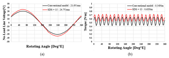 Performance comparison of double-rotor single-stator-type conventional model and SDS = 15 model: (a) no-load line voltage and (b) air gap torque waveform at load.
