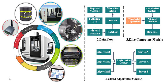Additionally, as shown in the Figure 3, the data storage of the digital twin system is managed by the data storage server. The collected sensor data, workpieces, tools, machine tools, and other information are saved in the data storage server and corresponding databases and data tables are established in the server. Considering the data types, structured data such as CSV and TXT are stored using MySQL, while unstructured data such as MP4 and PNG are stored using NoSQL to achieve reasonable data storage. Furthermore, the data storage server is responsible for data caching function and improves data flow read and write efficiency by accessing the data caching framework. Meanwhile, by establishing the data storage server, data can be transmitted within the LAN. Combined with network servers and microservice frameworks, parallel scheduling can be achieved between the intranet and internet, laying a foundation for improving computing efficiency.