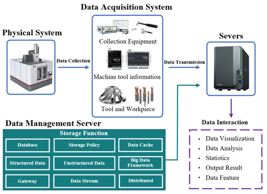 The data acquisition module is a module that receives data from data acquisition devices or obtains machine tool operating signals through CNC protocols, and requires end-to-end data read/write capabilities as well as data storage design. Data acquisition devices include various types of sensors (such as cutting force, power, acceleration, acoustic emission, temperature, etc.), cameras, RFID tags and readers, signal processing equipment, etc. The machine tool protocol is based on the CNC system of the machine tool and uses protocols such as OPC-UA, MT Connect to obtain information such as the feed axis coordinates, speed, load, and alarm signals of the machine tool. Currently, industrial data acquisition devices are more of a combination of the two. Since the collected data may come from different machining units with different collection frequencies and expression attributes, higher requirements are placed on the design of the database and the transmission of data. Moreover, the increasing input devices such as sensors require greater scalability of the data acquisition module and database. The remote multi-source nature of the equipment poses a challenge to the high concurrency of the machining unit twin system.