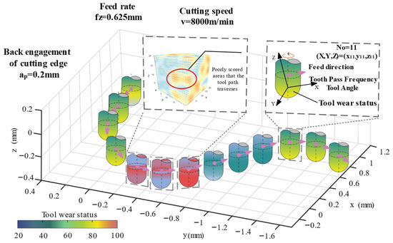 Collected simulation information of 125 machine tool position points in the processing area, and then used Kriging interpolation to interpolate them. After converting the Kriging algorithm into code and embedding it into the digital twin system, the input variables, such as tool path and cutting amount, are used as input variables of the digital twin system for calculation, and the evaluation results of the tool path are obtained, which provides data support for the machining parameter optimization module. Figure 10 and Figure 11 show the calibration diagrams of the dynamic characteristics spectrum of the machining space generated based on the collected data.