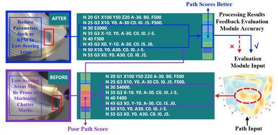 The module of process optimization for machining units is responsible for optimizing the machining process by adjusting process parameters, tool paths, tool positions and orientations, and selecting optimal tools based on the results of the evaluation module. It builds on the evaluation results from the previous module and aims to address any regions that do not meet the required machining specifications. By calling upon the results from the evaluation module, it proposes improvement strategies and solutions for specific machining system parameters at non-compliant tool positions, and stores the optimized information in the database container for future reference. In addition, the optimization information is converted into machine-executable code and used to control the machining process by adjusting the spindle speed in a closed loop, completing the operation in the virtual space.