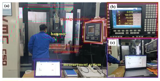 Modal experiment: (a) experimental test scenario (b) machine tool spindle position (c) modal test system.