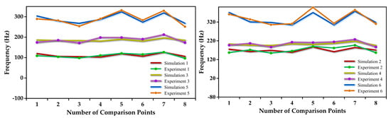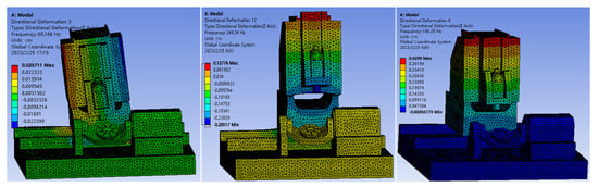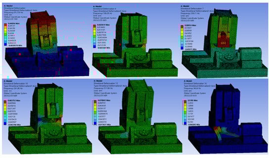 Figure 7 shows the modal simulation of the machine tool in the same attitude. Figure 8 shows the different machine position modes and according to the experimental and simulation data comparison in Figure 9, when analyzing the dynamic characteristics of the machine tool in a static state, the compared data have small differences. The error between the natural frequencies obtained from the experiment and those obtained from Ansys-Workbench finite element modal simulation is approximately between 3% and 12%. The error value is relatively small. Therefore, it can be proven that the accuracy and effectiveness of the established model of the dual-rotary five-axis machine tool, which can be used for modal analysis of the machine tool.