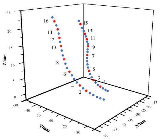 Finally, the blade was measured according to the measurement procedure. Since the blade is thin and may deform during the machining process, a margin of 0.2 mm was reserved, and the tolerance of the measurement points was set to ±0.2 mm. The measurement data are shown in Table 4 and Table 5.