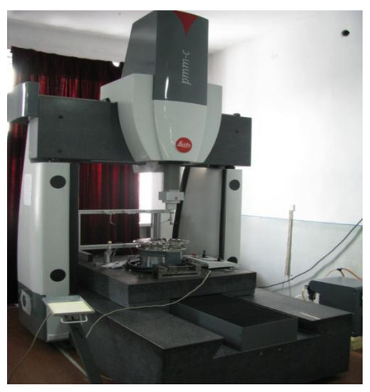 The optimal 16 measurement points (highlighted in red) were selected on the tested blade, as shown in Figure 14. Next, the impeller was fixed on the coordinate measuring machine (PMM-C) measurement table, as shown in Figure 15. The overall impeller measurement steps for PMM-C are as follows: (1) Place the impeller on the turntable; (2) Establish the impeller coordinates; (3) Edit the individual blade detection program; (4) Add turntable blade rotation instructions to the program; (5) Use the embedded PC-DMIS to complete the measurement; (6) After the inspection is completed, output and print the report.