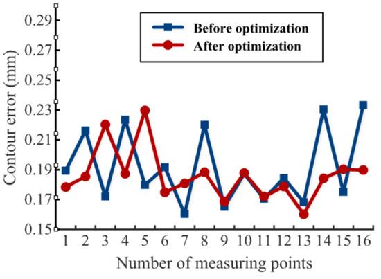 In Figure 17, the blue curve represents the workpiece contour error detection data for the control group under the machining parameter experiment, and the red represents the detection data for the experimental group. As can be seen from the figure, for the blade that has not undergone optimization of multi-axis coordinated machining error evaluation and control method based on digital twin technology, the maximum machining contour deviation of the blade is 0.2333 mm, and the overall contour error polyline has a steeper and more tortuous slope. However, for the blade detected after optimization of multi-axis coordinated machining error evaluation and control method based on digital twin technology, the maximum contour deviation of the blade is 0.2298 mm, Meanwhile, as shown in Table 5, the pass rate has increased from 68.75% to 87.5%.and its overall contour error polyline has a flatter slope. It can be concluded that the average contour error of the blade detected after optimization of multi-axis coordinated machining error evaluation and control method based on digital twin technology is reduced by 18.75%. Therefore, it can be seen that the proposed method of multi-axis coordinated machining error evaluation and control based on digital twin technology can effectively improve the surface quality of the workpiece.
