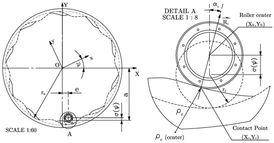 In pure rolling conditions, can be assumed to be equal to . However, to consider the possibility of sliding at the cam-roller interface, pure rolling cannot be assumed, since during slippage . Hence, a different approach is required. The determination of the angular velocity of the roller allowing the possibility of slippage will be treated later on.