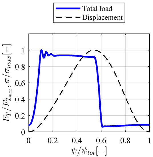 The total load profile is obtained by adding up as explained in Section 2.2. The shape of the force profile mainly reflects the pressure profile, since hydraulic forces contribute the most to the total load. The load profile is highly asymmetric (with respect to the displacement profile) and contains abrupt variations. The high-load phase corresponds to the compression stroke and the low-load phase to the suction stroke. The oscillations that follow the peak load reflect the pressure overshoot produced by the discharge valve lag [31]. After the sudden load decrease at the end of the compression stroke, the small oscillation corresponds to the underpressure spike due to the lag of the suction valve [31].