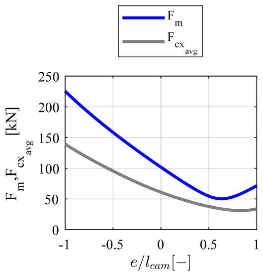 The geometrical parameters and reference conditions for the kinematic and force analysis can be found in Table 1 and the results of the follower offset optimization are presented in Figure 6, where e was varied from to to compute and . For a radial follower (RF), . For this configuration, neither nor are the lowest.
