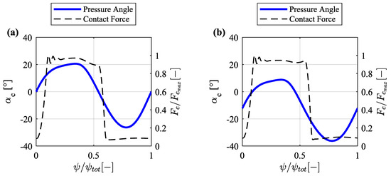 Pressure angle and contact force. (a) RF configuration. (b) OF configuration.