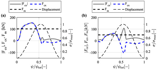 Figure 7 shows the pressure angle (in ) and the normalized contact force for the RF and OF configurations. It is important to acknowledge that the displacement profile is non-symmetrical, and thus, the absolute pressure angle values during compression and suction strokes are not the same. This intentional asymmetry aims to moderate the pressure angle during compression to control the magnitude of the side thrust. For the RF configuration, the maximum during the compression and suction strokes are and , respectively. On the other hand, by optimizing e, the maximum can be reduced to during the compression stroke and increased to during the suction stroke. This notable reduction in the pressure angle attained with the OF configuration (during the compression stroke) enables a significant side thrust reduction (Figure 8), particularly where the total load is high. Additionally, it should be noted that the OF configuration brings positive changes to the contact force when compared to the RF configuration. During the compression stroke, is slightly reduced (lowering contact stresses) and during suction, it is slightly increased (enhancing traction).