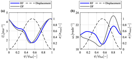 Figure 9 shows the cam surface velocities and roller angular velocities for the RF and OF configurations (computed assuming pure rolling). From Equations (1) and (2), it becomes evident that introducing offset, (i.e., ) changes the global position of the center of the roller follower, and hence, the relative position in the coordinate system. Consequently, changes in the camring curvature, surface velocity, pressure angle, and the side thrust magnitude must be expected, even while the displacement profile is maintained. In this case, the optimum eccentricity (), results in a slight reduction of the cam’s surface speed during the compression stroke and a slight increase during suction. The effects of eccentricity are much more evident in the roller’s angular speed, where decreases during compression and increases during suction. The differences between the velocities of both configurations are attributed to the changes in the curvature of the cam and the movement of the point of contact (i.e., ).