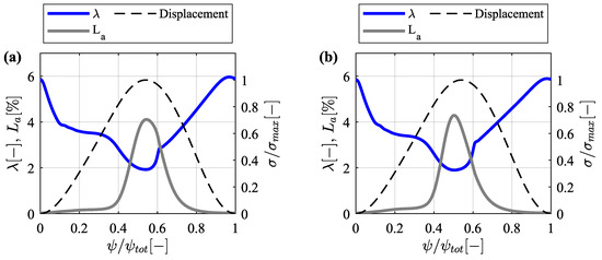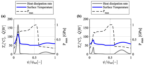 In addition, in Figure 9, it is also important to note that the entrainment motion (i.e., ) remains above zero. Hence, for the calculation of film thickness, squeezing motion can be neglected [32]. In situations where flow reversal does not occur, transient effects appear to be negligible in the prediction of changes in the oil film thickness [10,11]. Therefore, in this work, the quasi-static solution has been considered suitable and valuable for predicting the tribological behavior of the cam-roller contact.