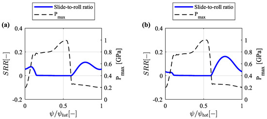 where the limiting shear stress coefficient, , is a lubricant’s property that can be obtained from its traction curve [47], is the hydrodynamic pressure, and p is the average contact pressure. Equation (A5), is used to compute [48]. It is worthwhile mentioning that this variant of the Roeland’s equation can largely overestimate friction at high-pressure high-slide-to-roll ratio conditions as shown in reference [10]. Nevertheless, in this work, its use can be justified since the maximum contact pressure is limited to 1 and the maximum is <.