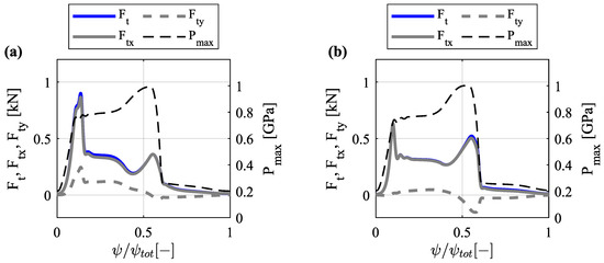 From Equation (27), it can be deduced that and are interrelated. The contact force affects the traction coefficient and vice-versa. Nevertheless, the contribution of to is very small, and therefore, can be considered independent [11,19]. Thus, the expression for is reduced to: