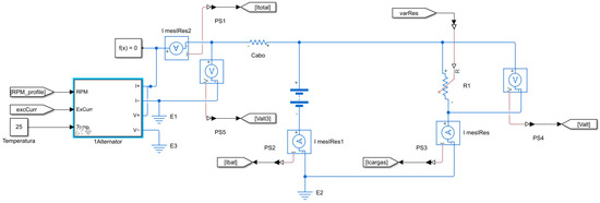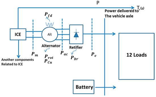- Soeiro, L.G.G.; Filho, B.J.C.; Sales, L.C.M. Comparison of Two Alternators Models for a Vehicle Electric Power Balance Simulation. In Proceedings of the IECON 2019-45th Annual Conference of the IEEE Industrial Electronics Society, Lisbon, Portugal, 14–17 October 2019; pp. 2640–2645. [Google Scholar] [CrossRef]