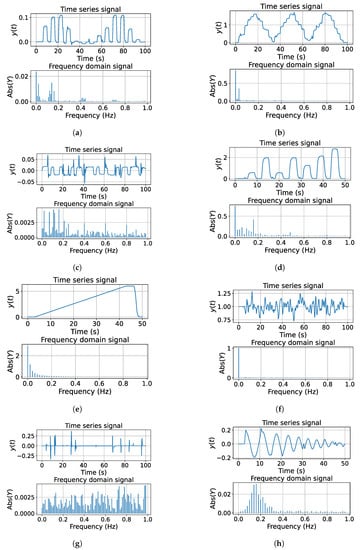 Set-Point Signals for dataset generation implemented (a) Random step with a return to zero. (b) Staggered Sinusoidal. (c) Staggered random steps signal. (d) Big random step signal with a return to zero. (e) Ramp signal. (f) Low-Frequency Noise Signal. (g) Null signal with disturbances. (h) Chirp signal.
