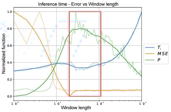 This method relies on taking into account the Average Inference Time () and Mean Square Error (). We sweep the Time Window sizes between a range of 1 to 1000, taking 100 window sizes that are separated logarithmically along the defined range. To evaluate the performance of our model, we use a dataset size of 4096 samples obtained from our dataset and measure  as well as  for the samples passed to our model. Finally, we calculate the performance (P) with the function defined in (7).